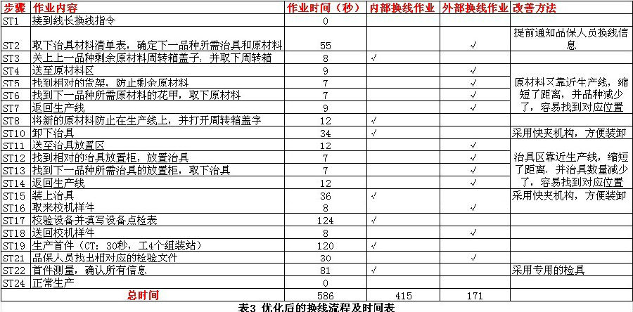 基于上述改善措施的導(dǎo)入,得到了新的換線流程和換線時(shí)間,如表3所示