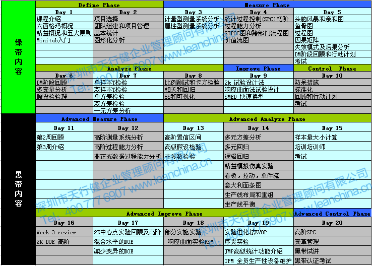 黑帶人員需接受天行健公司組織的系統(tǒng)培訓(xùn),共20天160學(xué)時(shí)。主要培訓(xùn)內(nèi)容見下表。